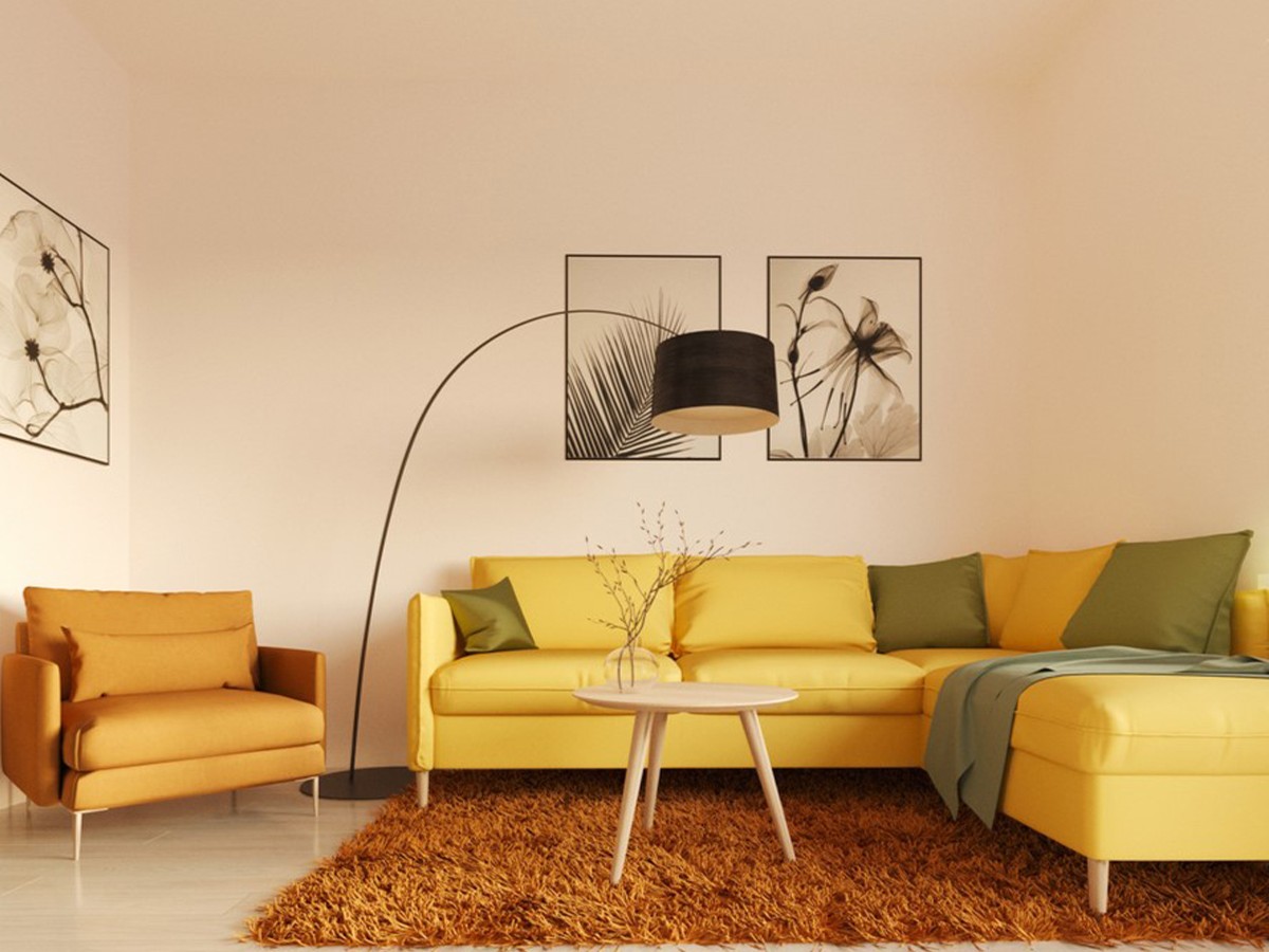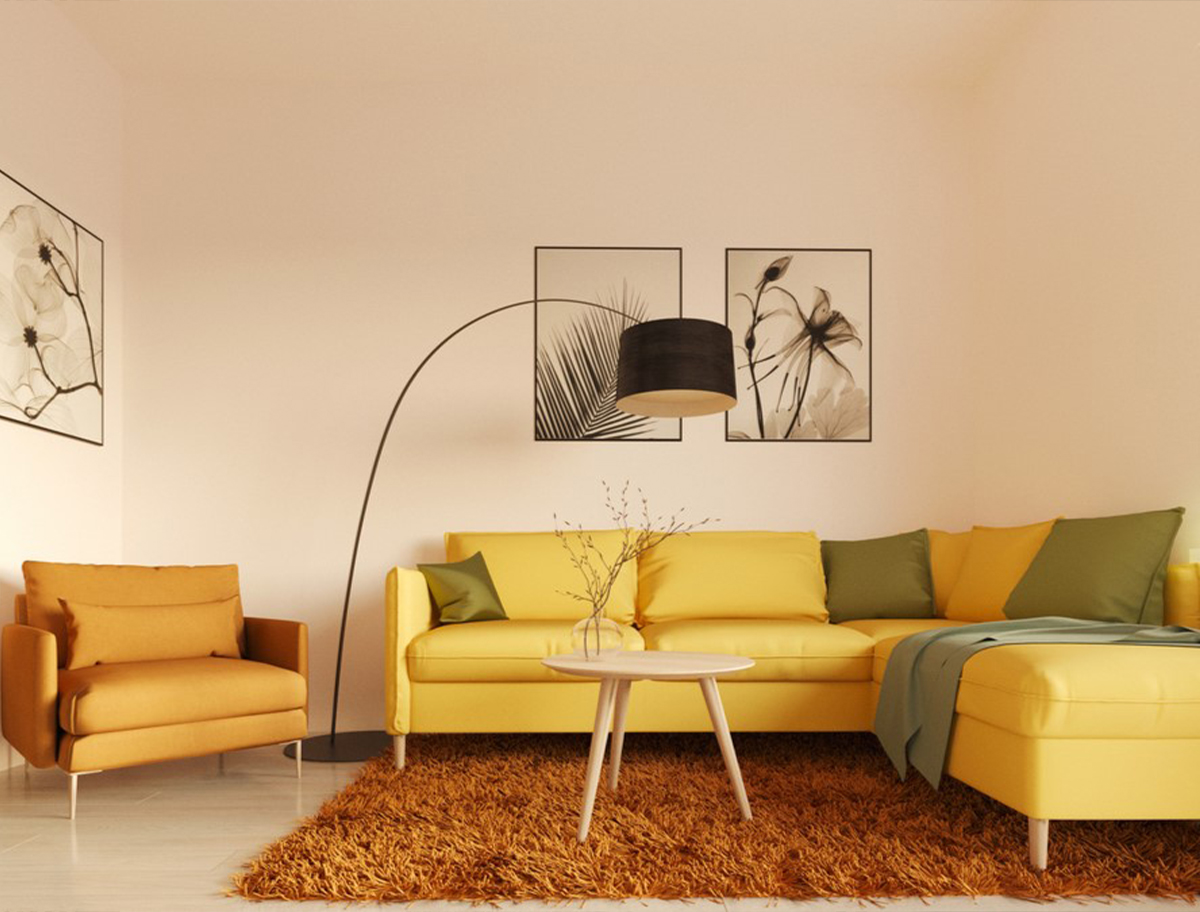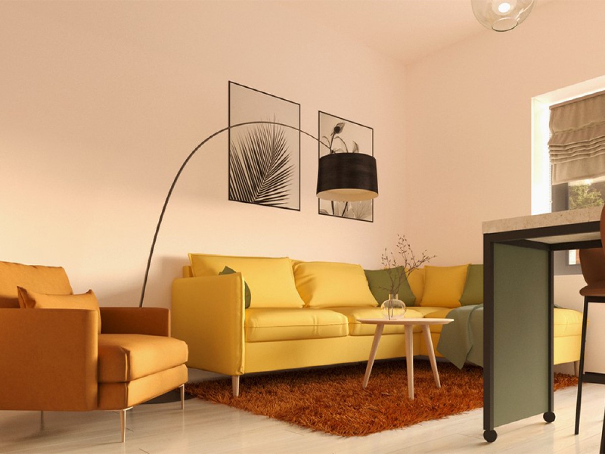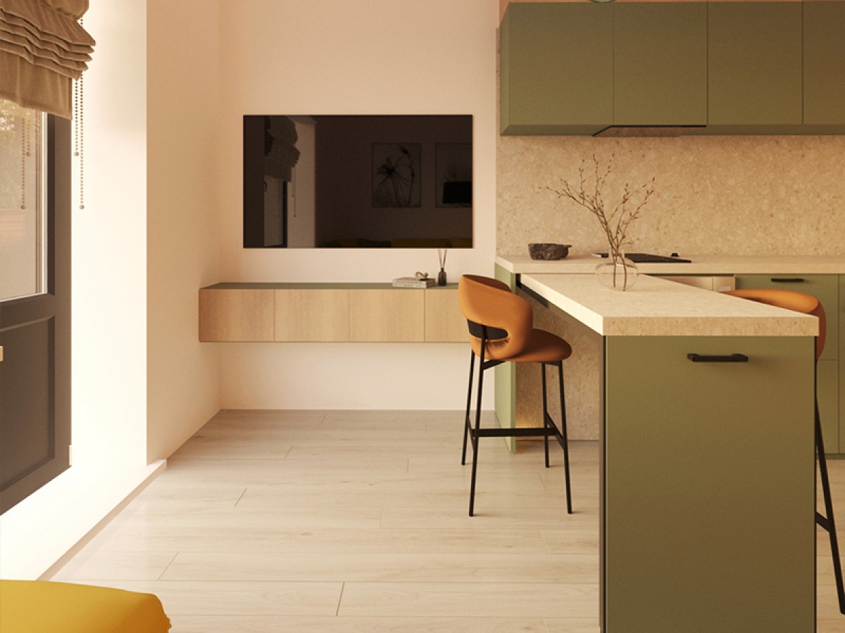 В мягкой зоне компактный диван CHIC от Hauska гармонично вписывается в интерьер даже в разложенном виде. Желтая кожаная обивка дивана визуально расширяет пространство комнаты и создаёт ощущение уюта. Терракотовый оттенок кожаного кресла FEEL повторяется в обивке обеденных стульев и ковровом покрытии. Кожаные материалы придают интерьеру надёжность и долговечность. Небольшой журнальный столик NARVIK из светлого дуба – еще одна функциональная деталь и элемент скандинавского стиля. Постеры с флористическими мотивами дополняют общую атмосферу и делают интерьер живым и органичным. Для зонирования используется выдвижная барная стойка, частично разделяющая кухню и гостиную. Столешницу можно легко задвинуть в шкафчик – практичное решение для небольшого пространства.