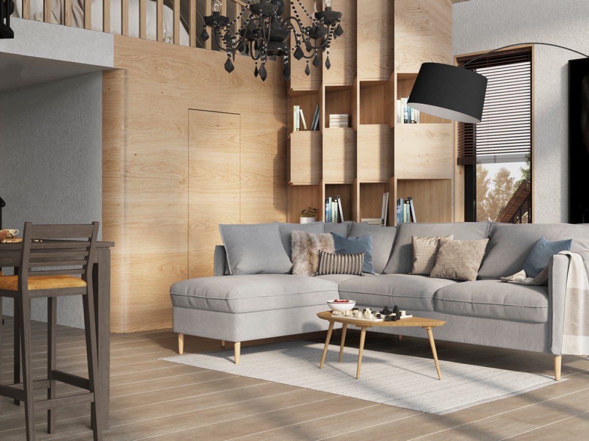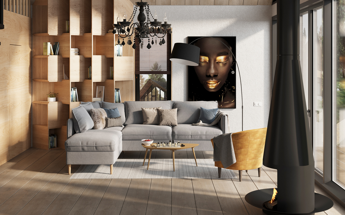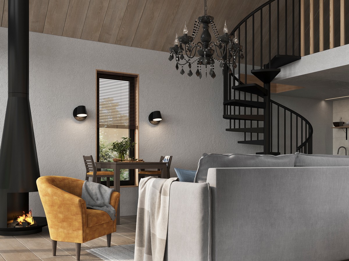 Именно таким получилось объединенное пространство гостиной-столовой в загородном доме с панорамными окнами и вторым светом. С одной стороны, здесь действительно много дерева – природный материал использован в отделке пола, потолка и стен, из натурального дуба выполнены геометричный стеллаж и журнальный столик NARVIK, из массива изготовлена барная группа AURORA в зоне столовой от Hauska. С другой – нейтральные скандинавские предметы интерьера made in Finland, выдержанные в спокойной гамме серых оттенков, «вступают в диалог» с яркими деталями, словно вырванными из контекста: постером Heart of Gold от датского бренда Malerifabrikken, черной винтажной люстрой-канделябром с богатым декором и черным камином футуристичной формы. Дизайн мягкой зоны в центре тоже строится на контрастном сочетании: комбинация сдержанного углового дивана CHIC с открытым краем от Hauska и яркого горчичного кресла ALINA от Scandic Style. Обивка теплого оттенка использована и для барных стульев AURORA.
