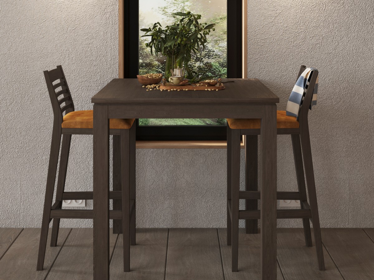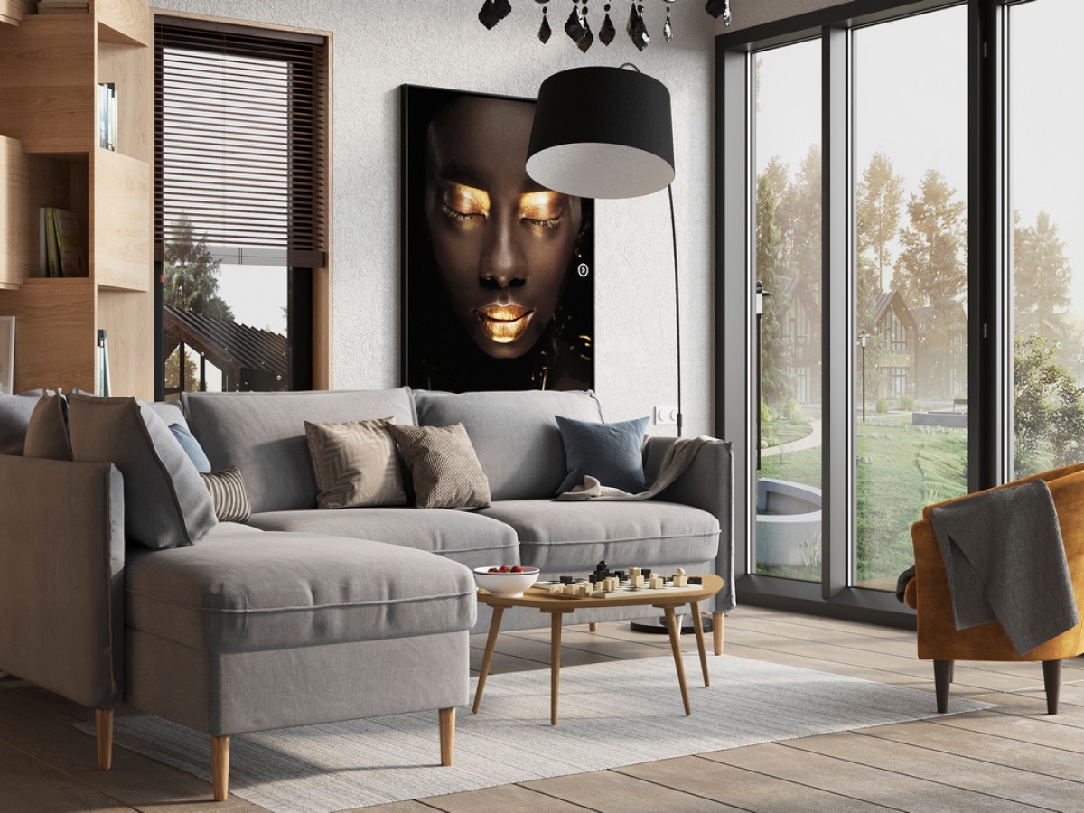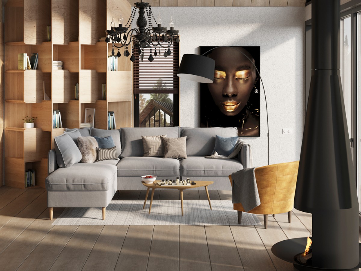 Именно таким получилось объединенное пространство гостиной-столовой в загородном доме с панорамными окнами и вторым светом. С одной стороны, здесь действительно много дерева – природный материал использован в отделке пола, потолка и стен, из натурального дуба выполнены геометричный стеллаж и журнальный столик NARVIK, из массива изготовлена барная группа AURORA в зоне столовой от Hauska. С другой – нейтральные скандинавские предметы интерьера made in Finland, выдержанные в спокойной гамме серых оттенков, «вступают в диалог» с яркими деталями, словно вырванными из контекста: постером Heart of Gold от датского бренда Malerifabrikken, черной винтажной люстрой-канделябром с богатым декором и черным камином футуристичной формы. Дизайн мягкой зоны в центре тоже строится на контрастном сочетании: комбинация сдержанного углового дивана CHIC с открытым краем от Hauska и яркого горчичного кресла ALINA от Scandic Style. Обивка теплого оттенка использована и для барных стульев AURORA.