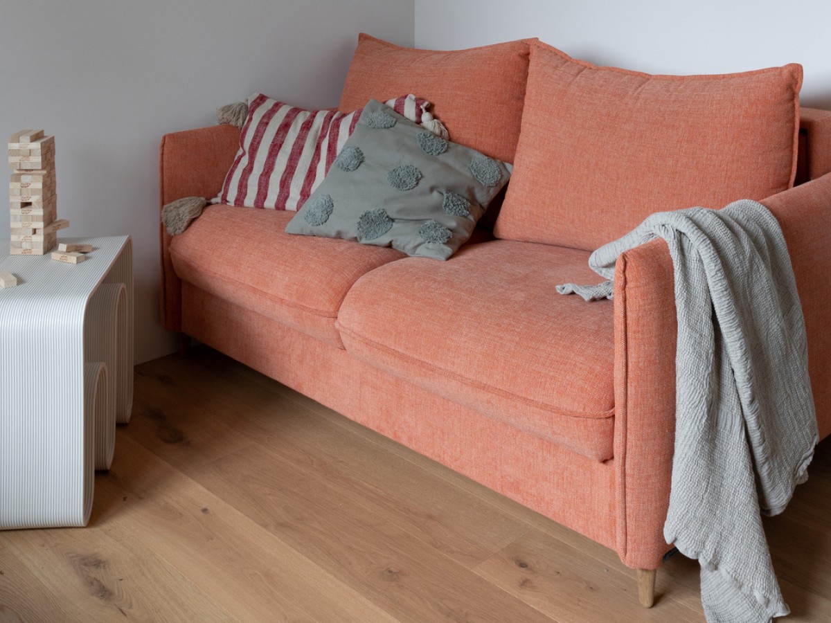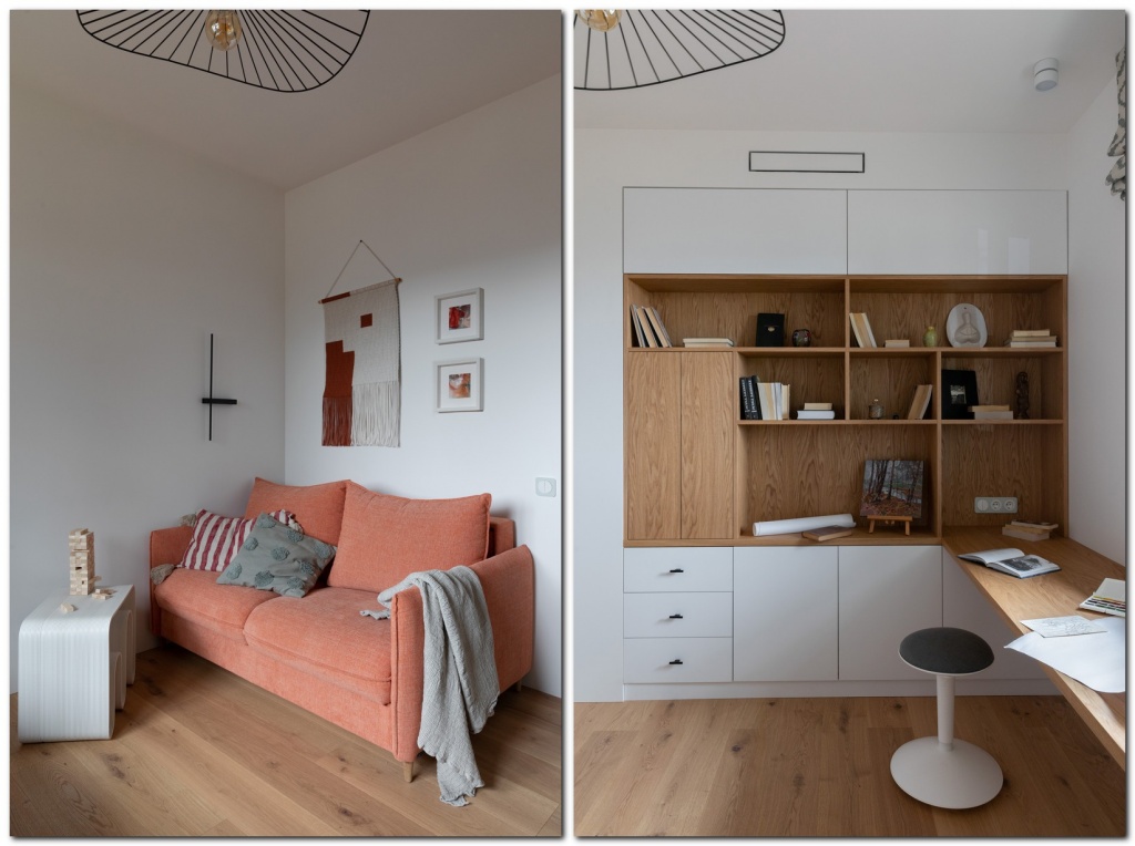 Дизайнеры стремились использовать качественную мебель, которая прослужит заказчикам не один год. Так, настоящим украшением кабинета стал компактный диван из коллекции Chic с механизмом раскладки NEST в велюровой обивке благородного оранжевого оттенка. Центром притяжения гостиной стал вместительный модульный диван из коллекции Loft в практичной серой обивке c легкой текстурой рогожки.