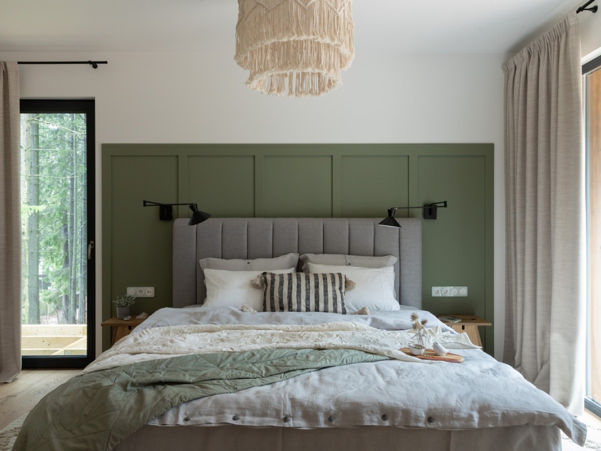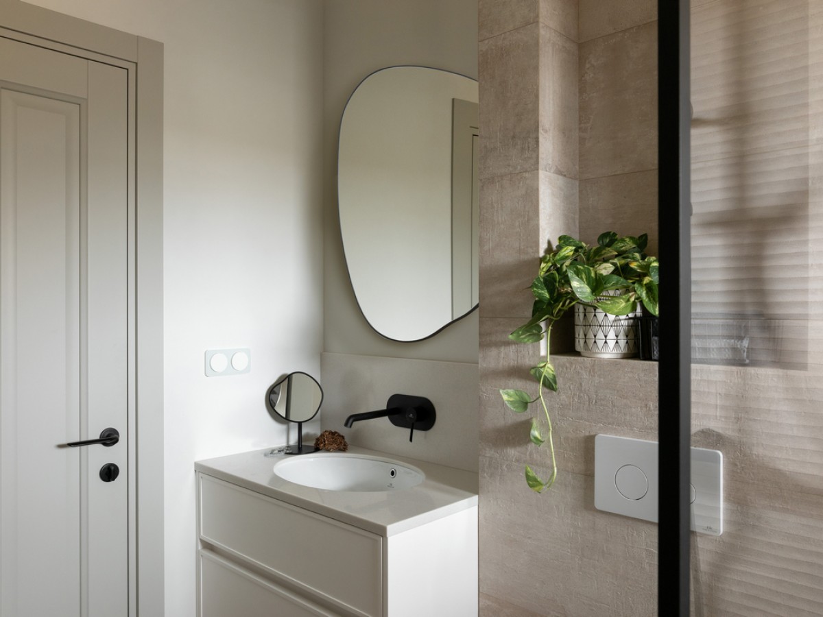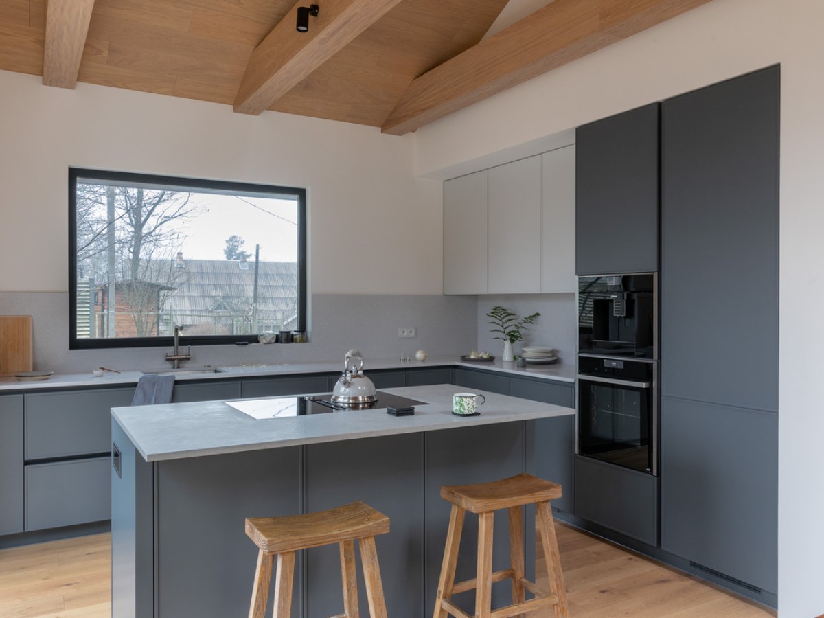 Для встреч с друзьями предусмотрели большое пространство кухни-гостиной и гостевую комнату. В основе интерьера – натуральные материалы и природная палитра. Инженерная доска с натуральной фактурой дуба с сучками и несовершенствами подчеркнула теплоту дома и его близость к природе. Спокойные цвета, близкие жителям Петербурга – теплый белый, припыленный зеленый, различные оттенки серого – создали умиротворенную загородную атмосферу.