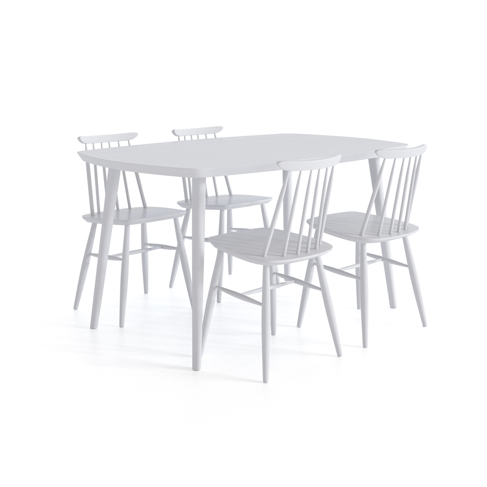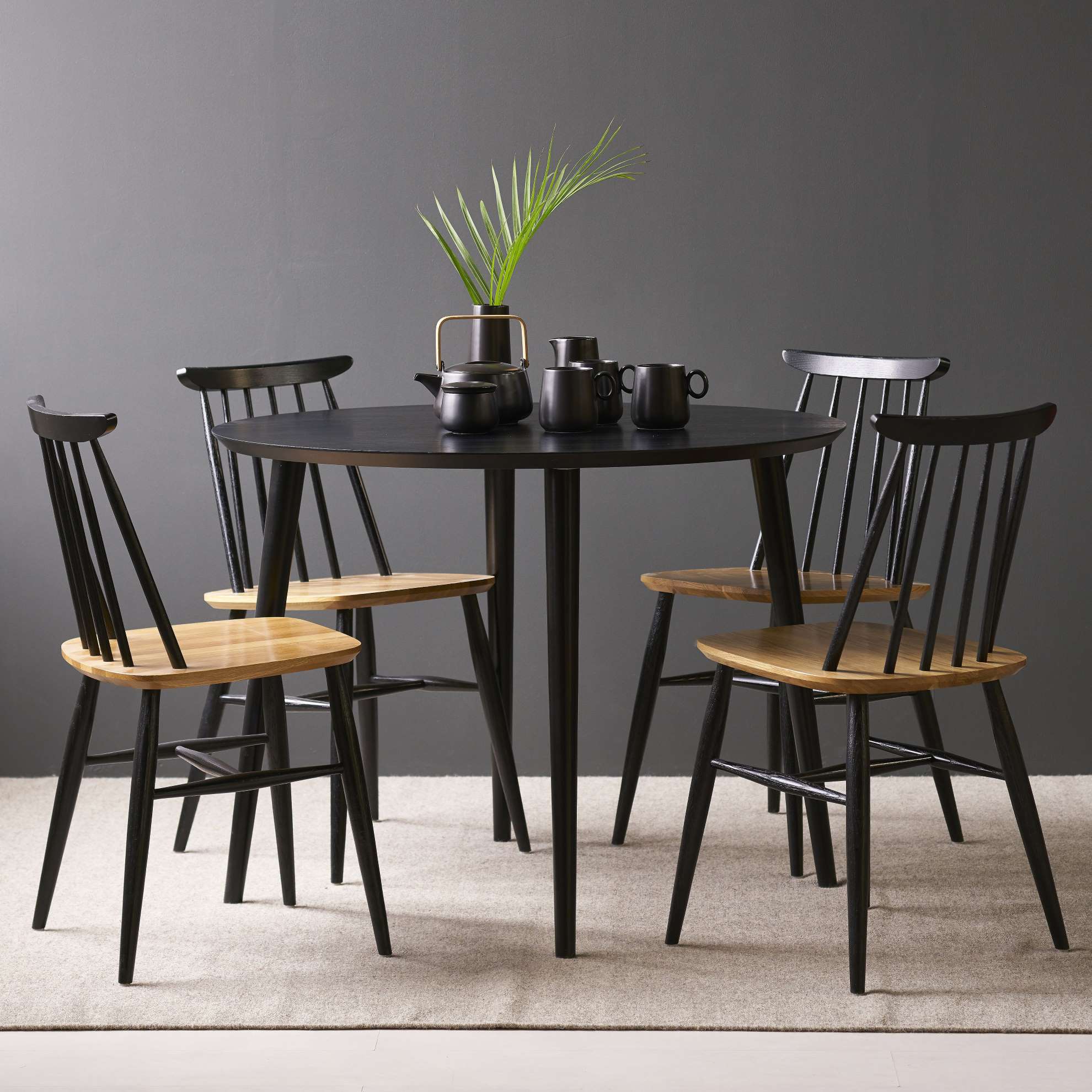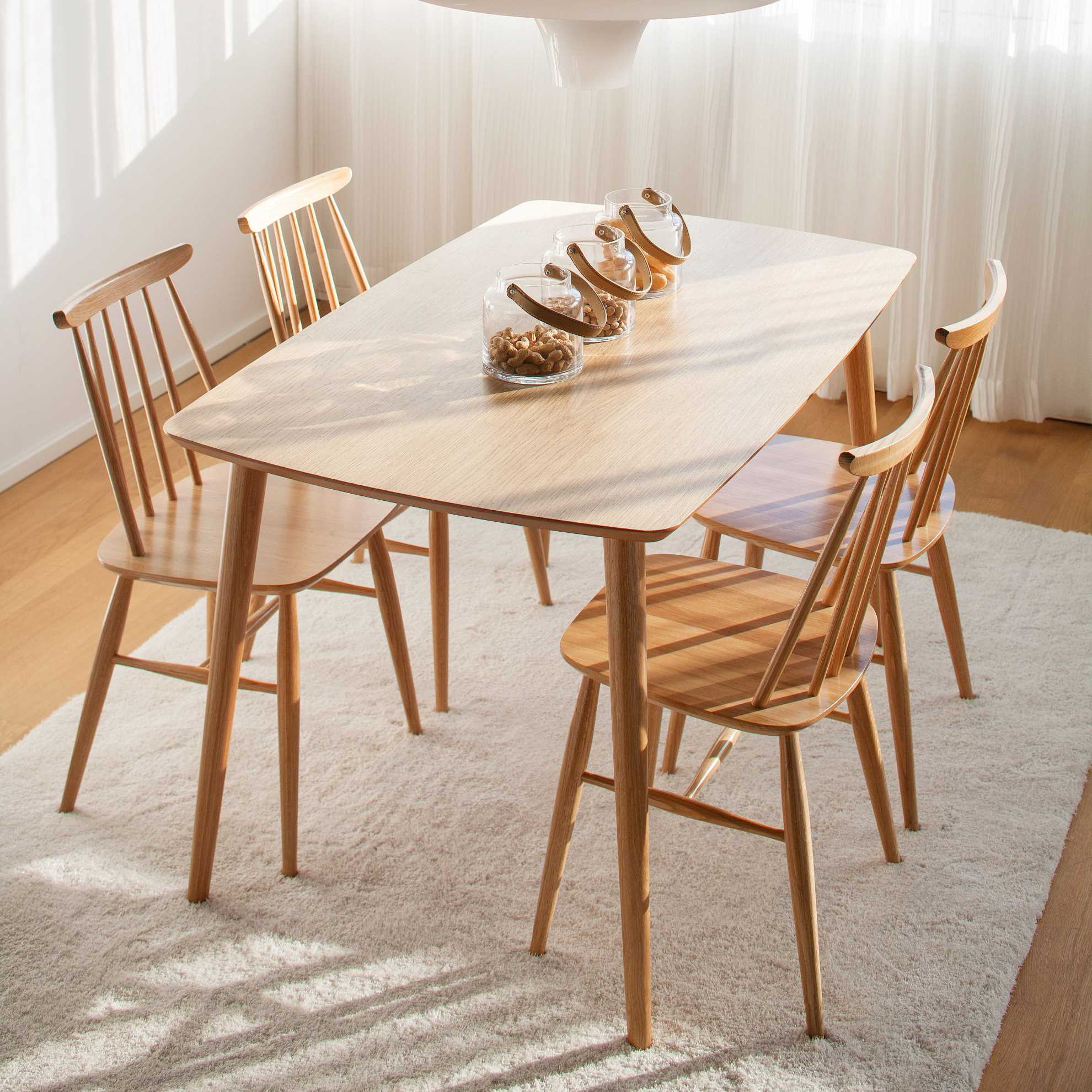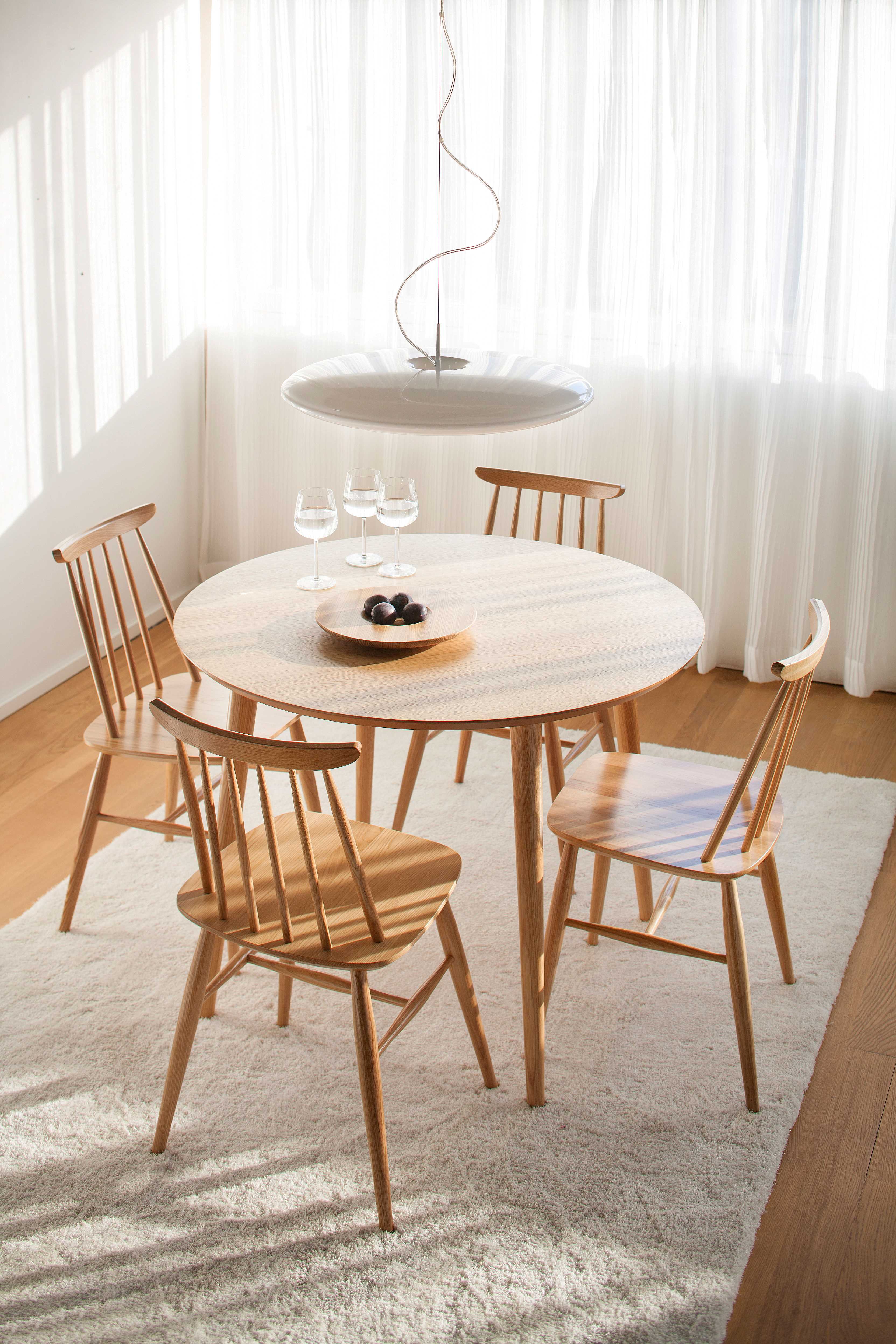 Классическая скандинавская коллекция для обеденной зоны: круглые или прямоугольные столы на утонченных ножках в различных тонировках, стулья со спинкой из реек и скамьи.