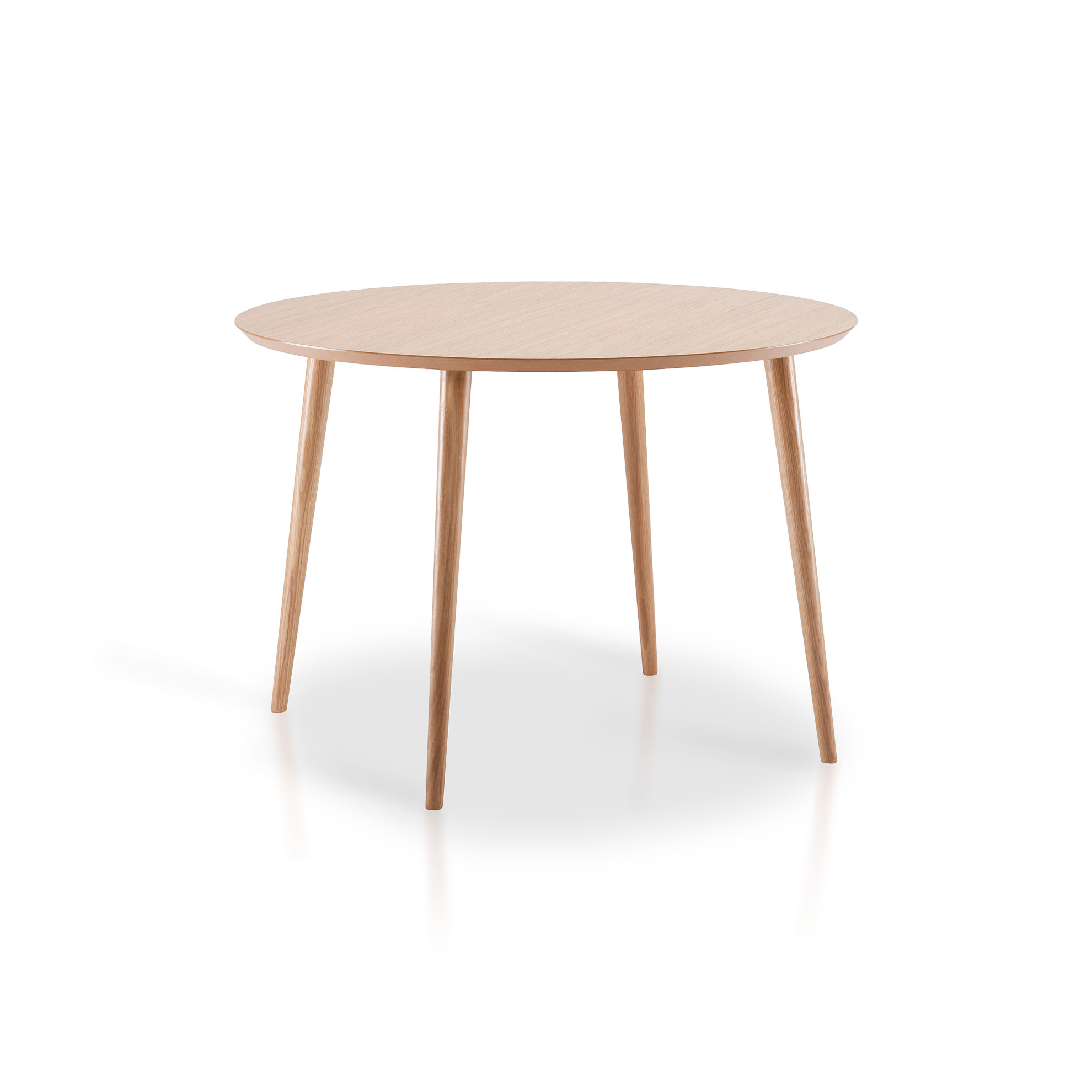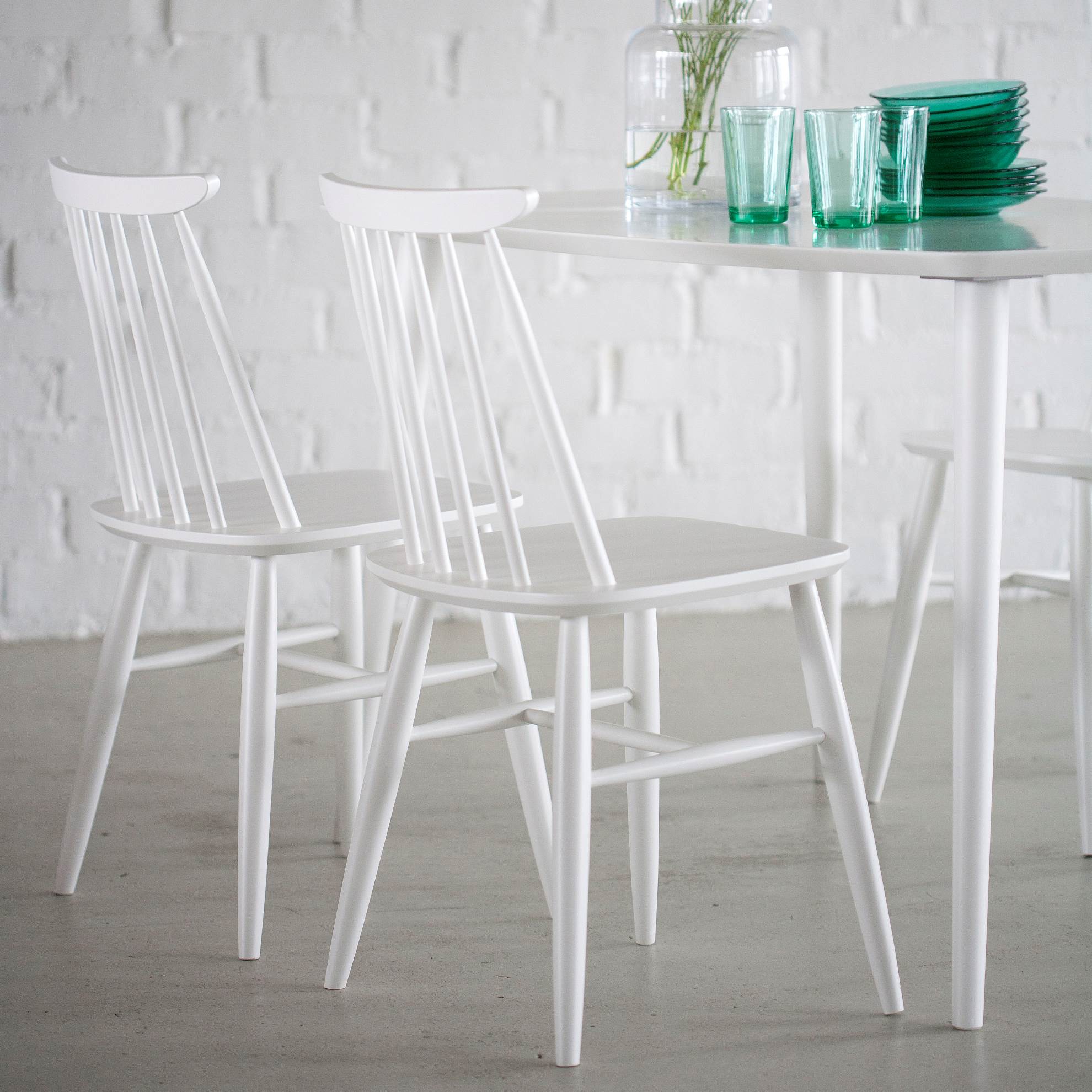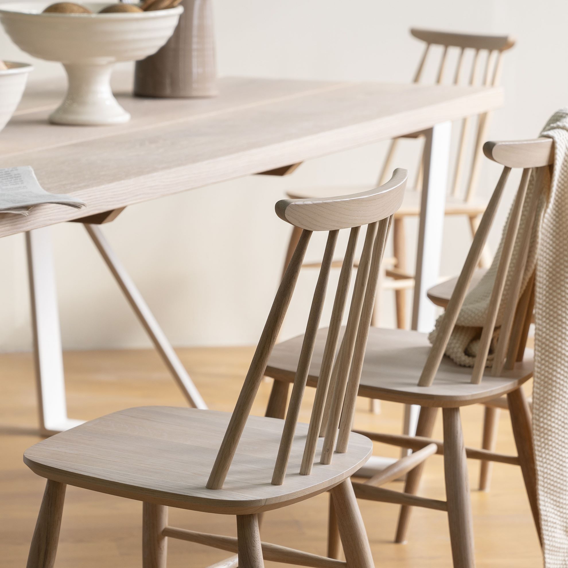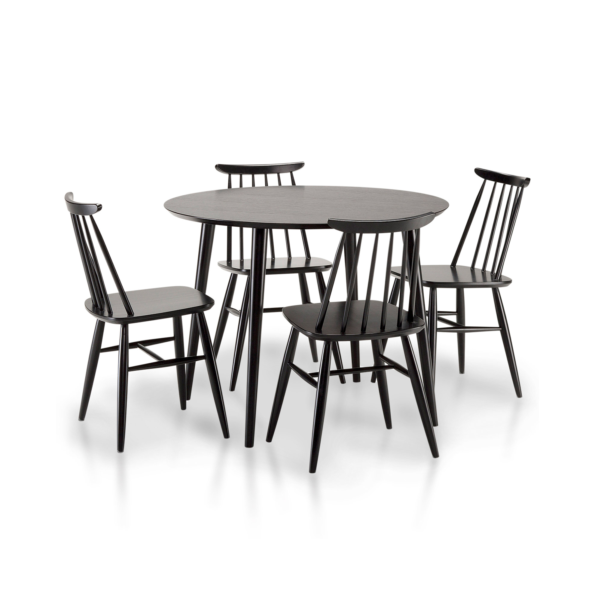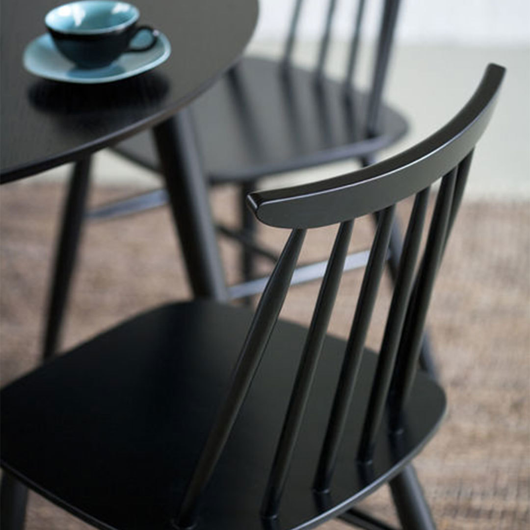 Классическая скандинавская коллекция для обеденной зоны: круглые или прямоугольные столы на утонченных ножках в различных тонировках, стулья со спинкой из реек и скамьи.