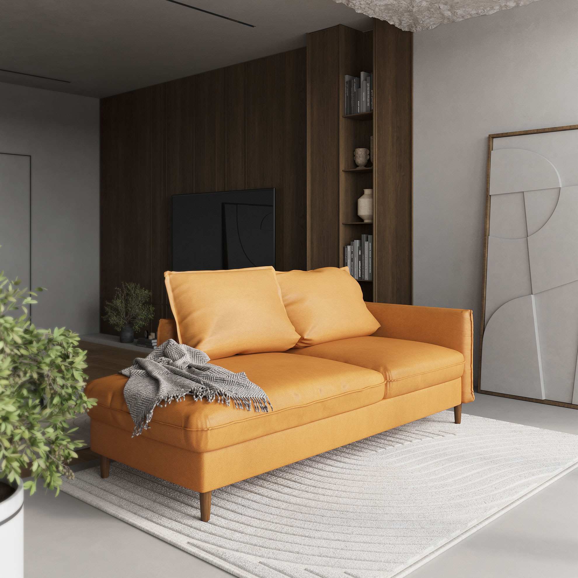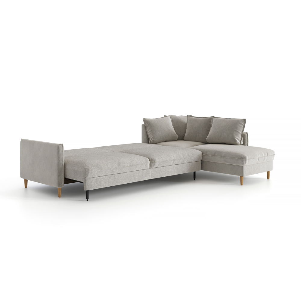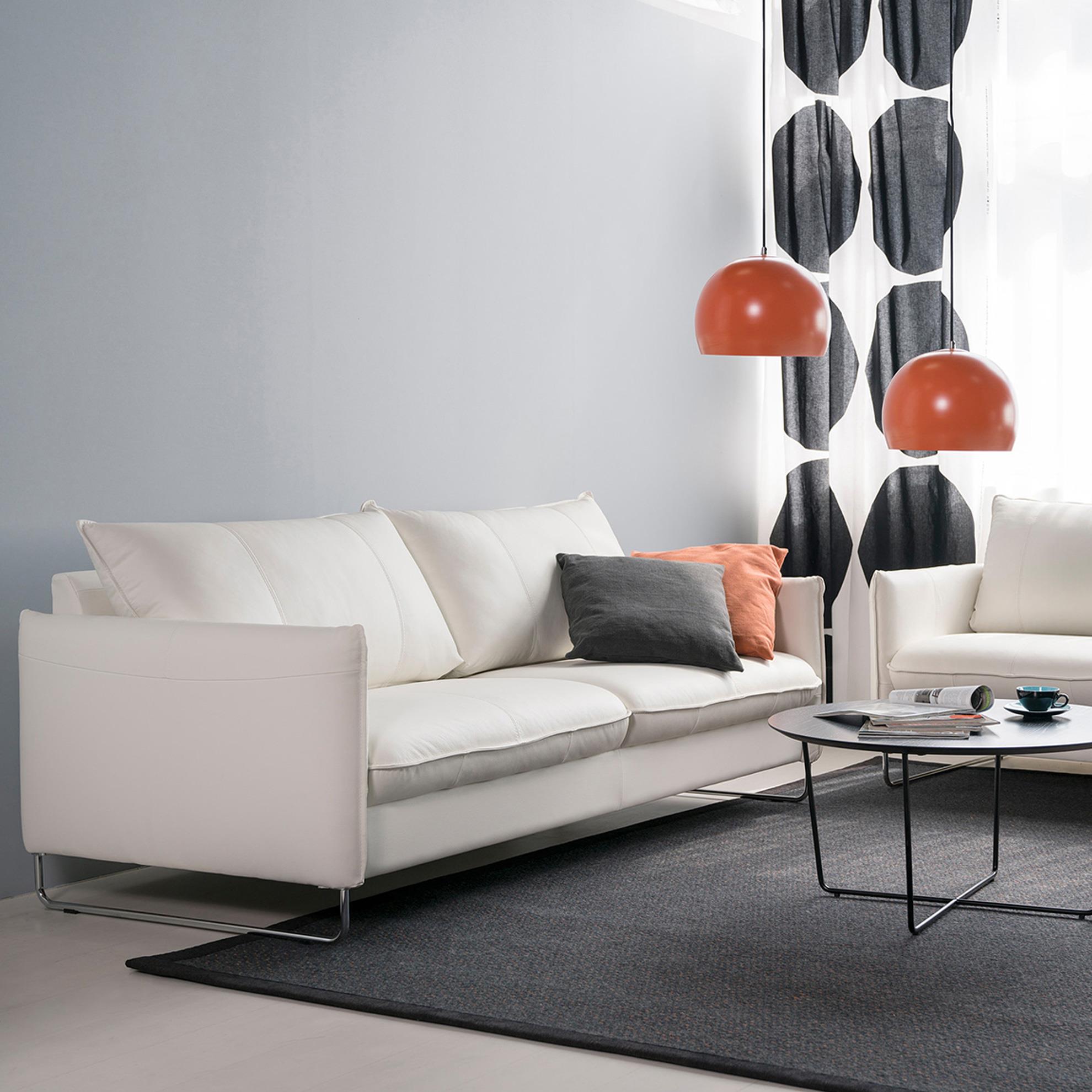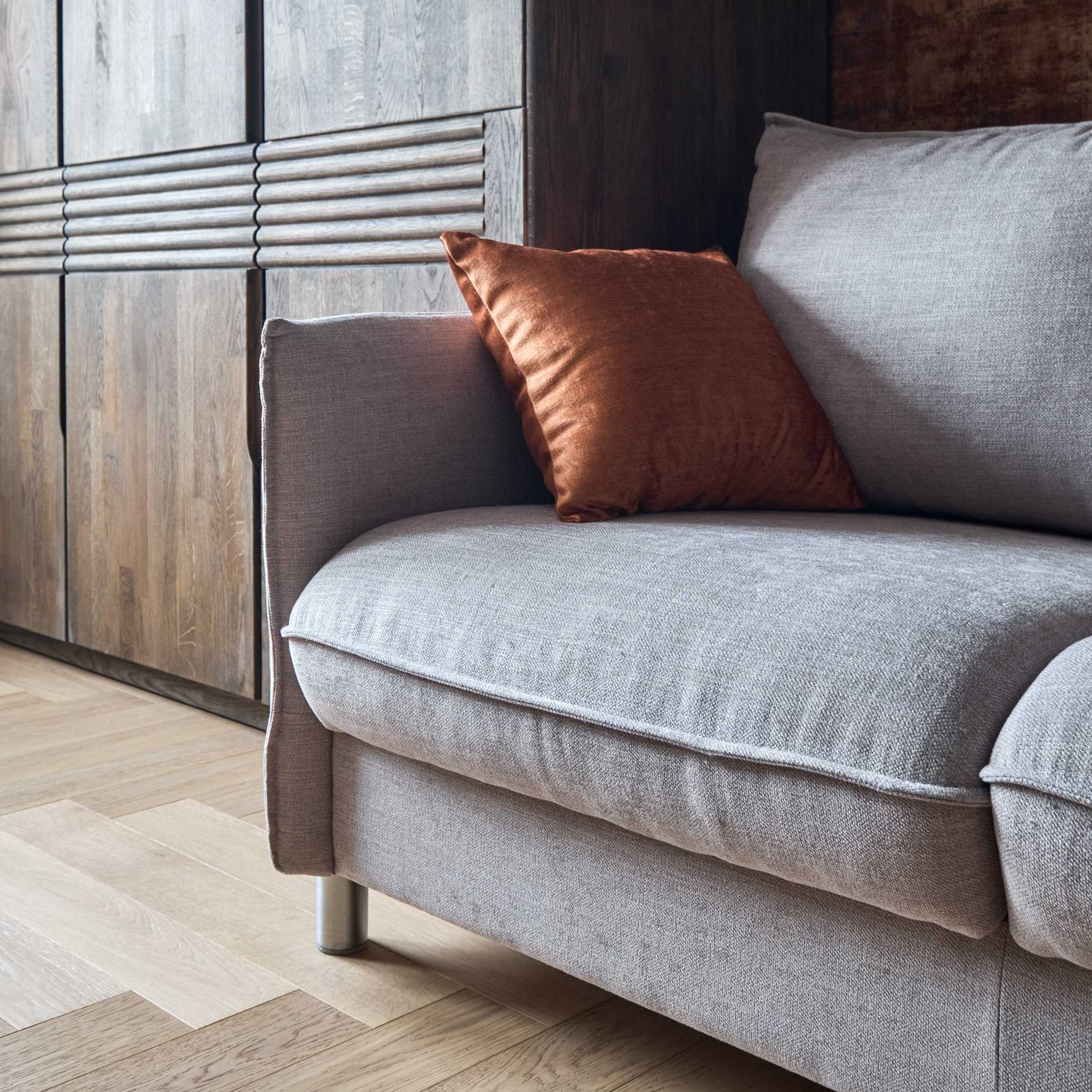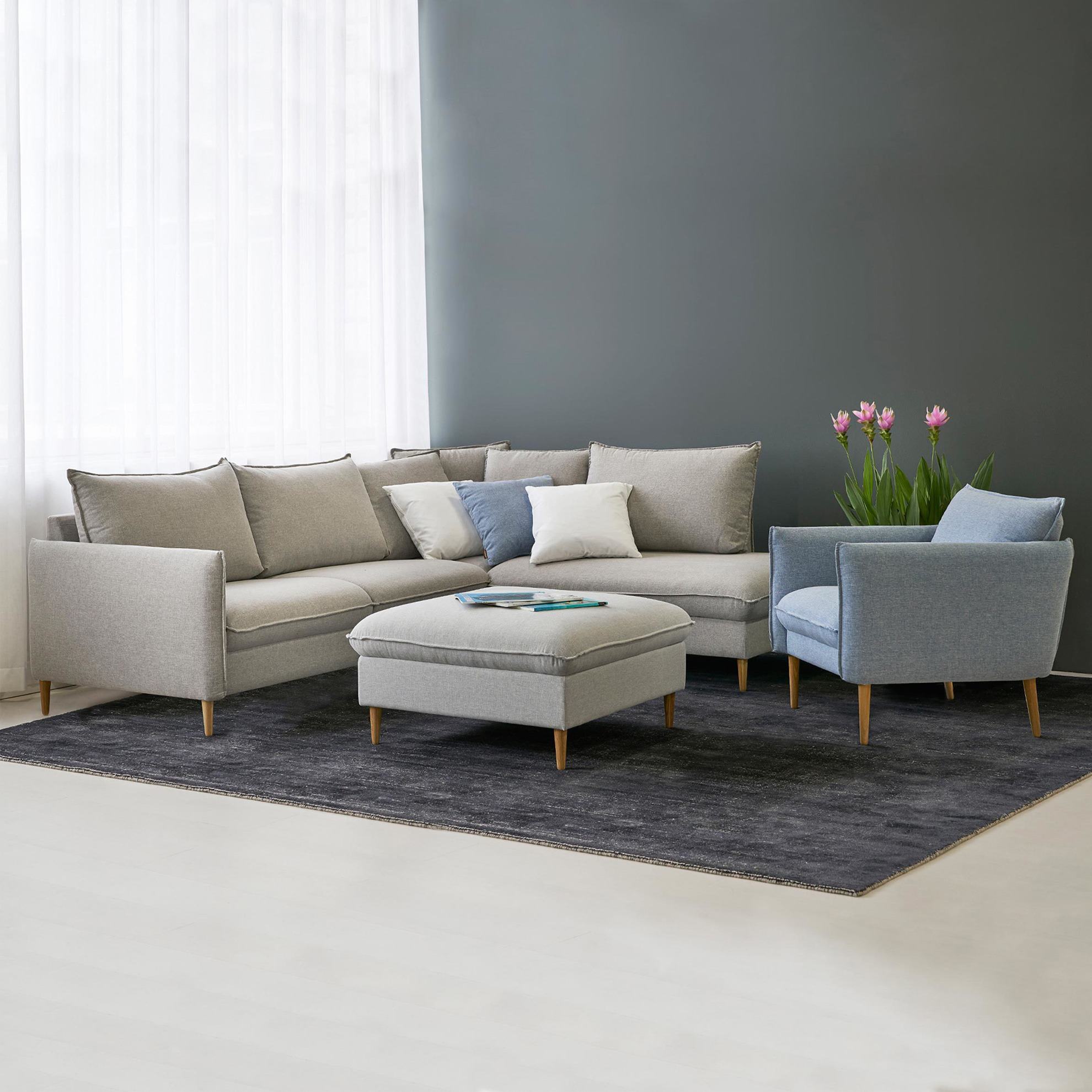 Главная особенность этой коллекции – возможность составить индивидуальный мебельный сет из отдельных мебельных модулей, заказать готовое решение с механизмом и без. Тонкие подлокотники, заострённые уголки подушек и высокие ножки привнесут лёгкость и чёткость линий в интерьеры в скандинавском и урбанистическом стиле. Гармоничную композицию для гостиной в открытой планировке составит диван с кушеткой и журнальный столик в мягкой обивке. Посадочные подушки отчетливо выступают за границу основания дивана, акцентная прострочка выполнена по центру торца подушки, а не по верхнему краю – детали создают узнаваемый профиль.