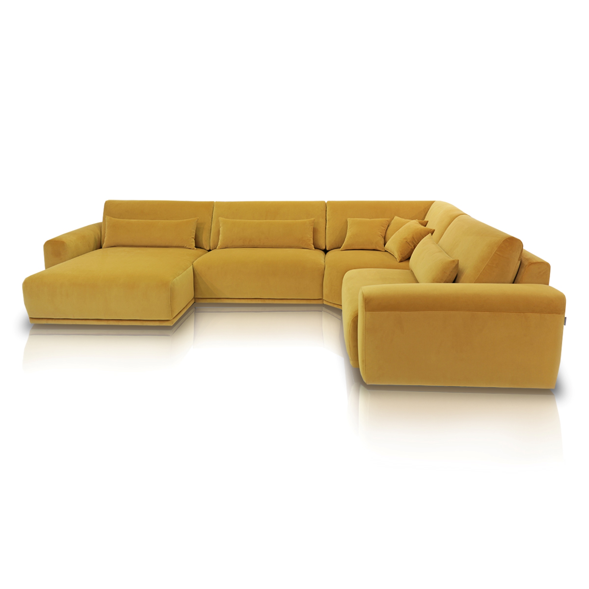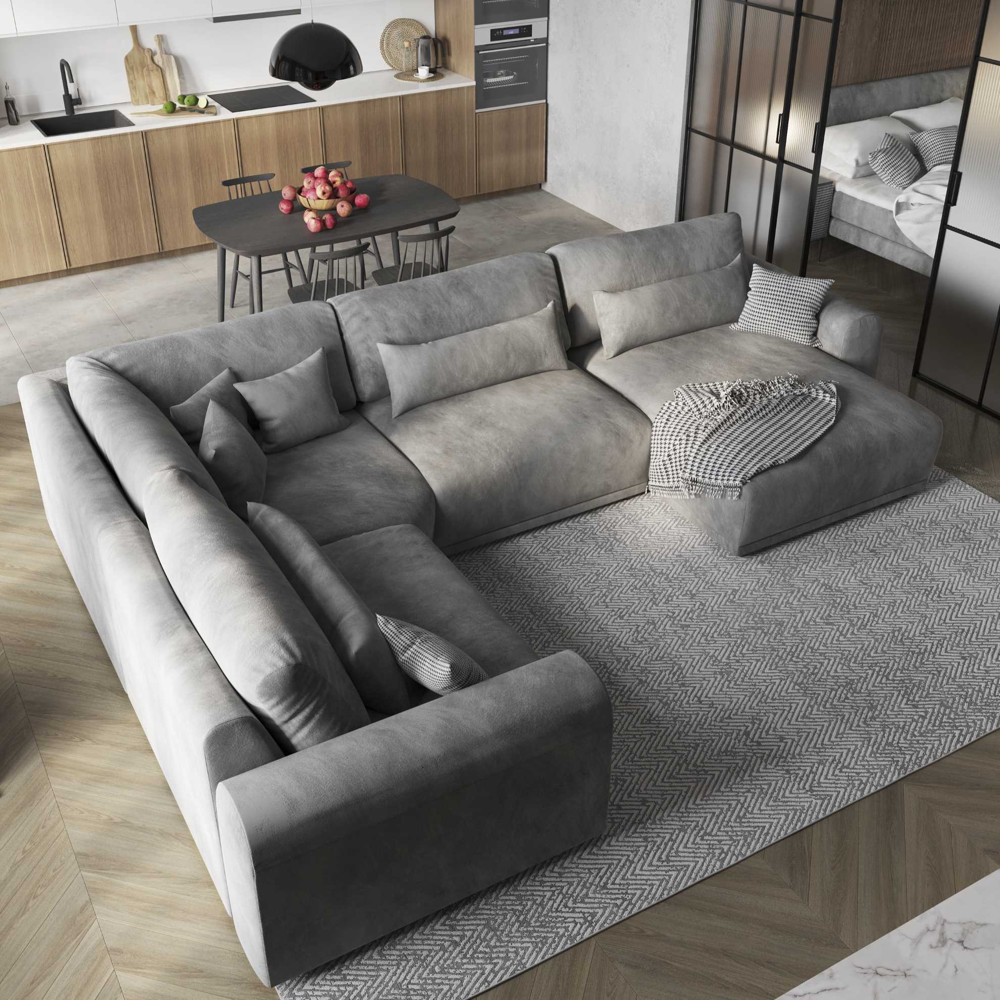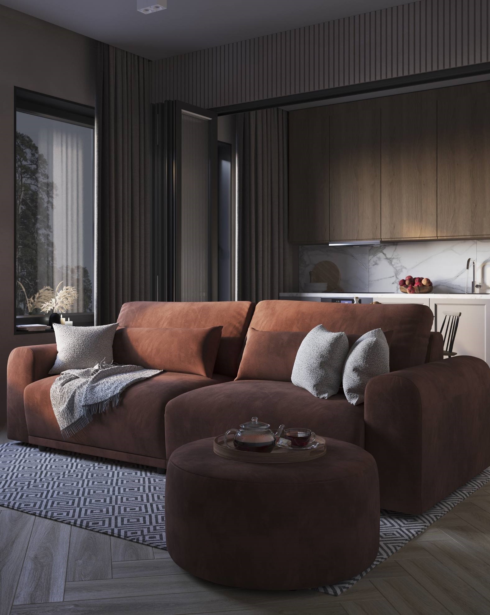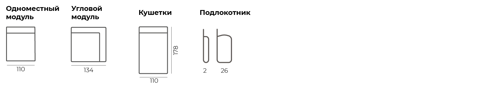 Несмотря на крупные габариты, прямоугольные формы и невысокая спинка создают ощущение легкости благодаря умело спрятанным ножкам. Модули кажутся парящими над полом. Округлые подлокотники и подушки с увеличенным углом наклона приглашают насладиться комфортом. Дополнительно можно заказать подушечки в контрастных цветах — добавить изысканности и визуально разбить крупные формы на цветовые сегменты.