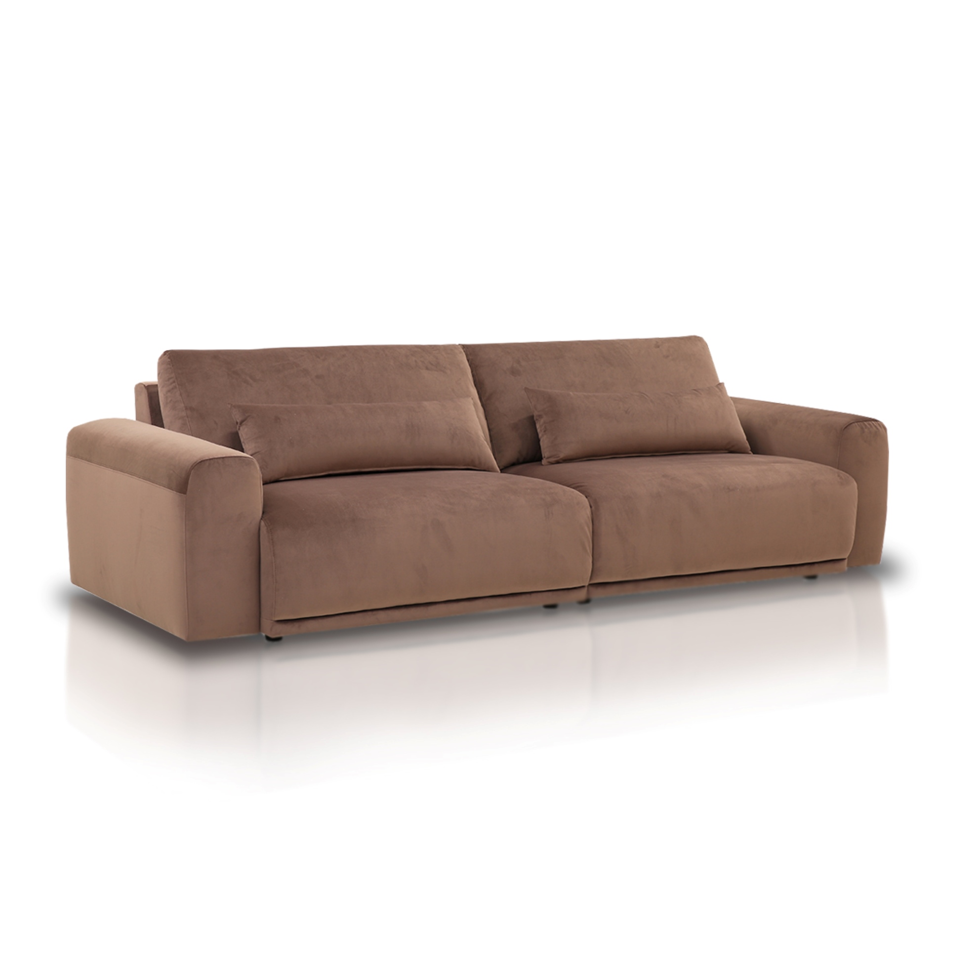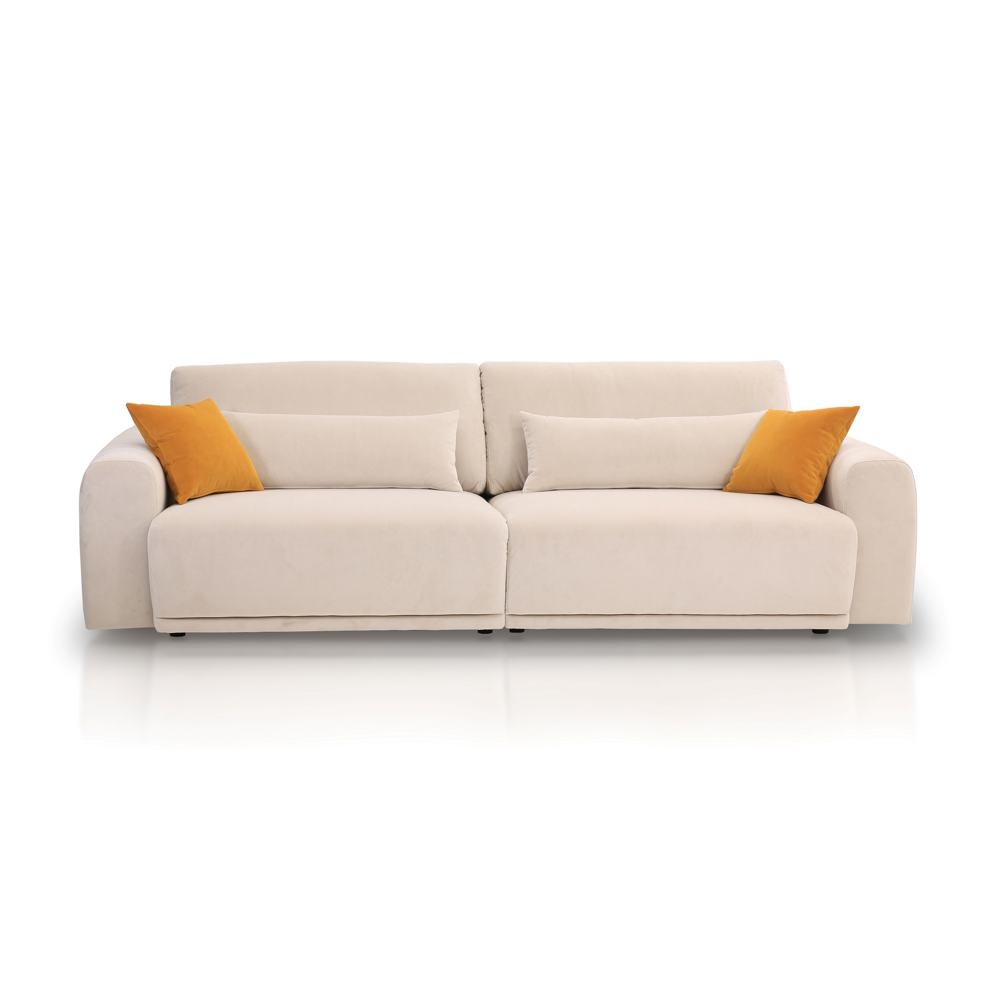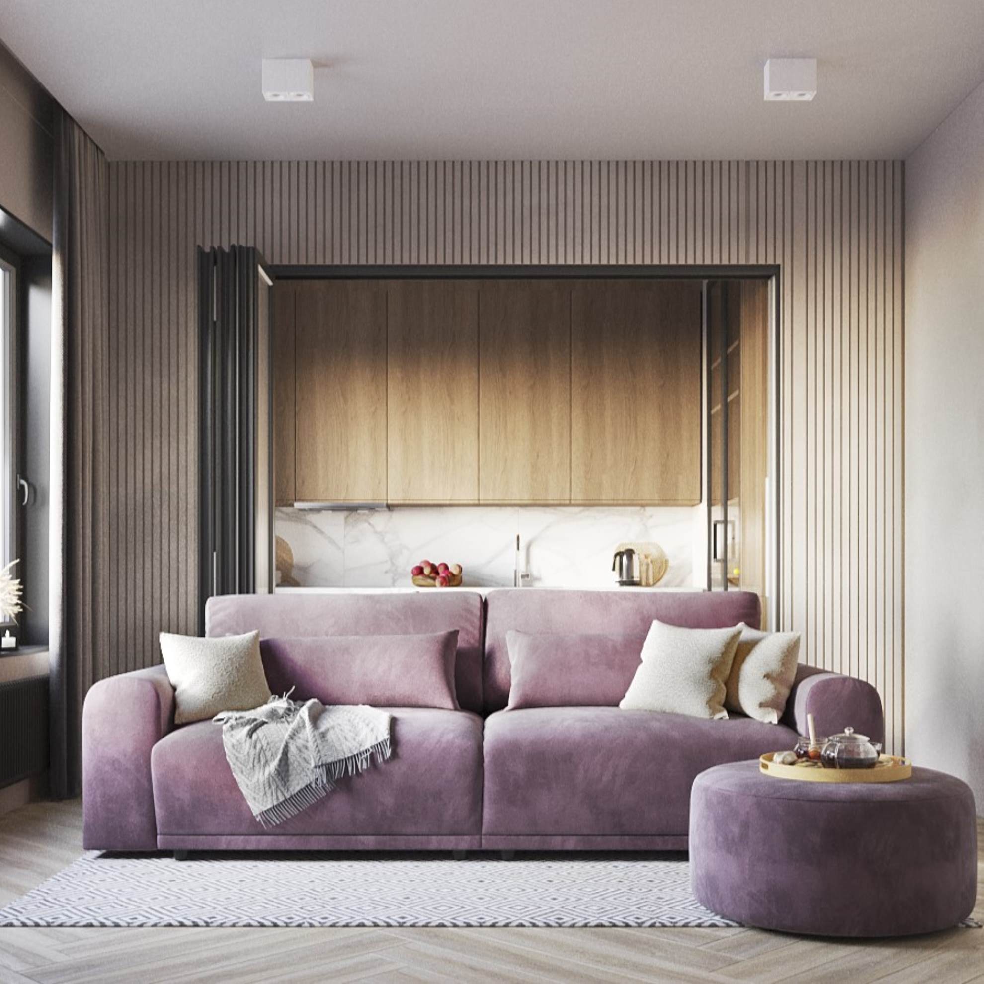Несмотря на крупные габариты, прямоугольные формы и невысокая спинка создают ощущение легкости благодаря умело спрятанным ножкам. Модули кажутся парящими над полом. Округлые подлокотники и подушки с увеличенным углом наклона приглашают насладиться комфортом. Дополнительно можно заказать подушечки в контрастных цветах — добавить изысканности и визуально разбить крупные формы на цветовые сегменты.