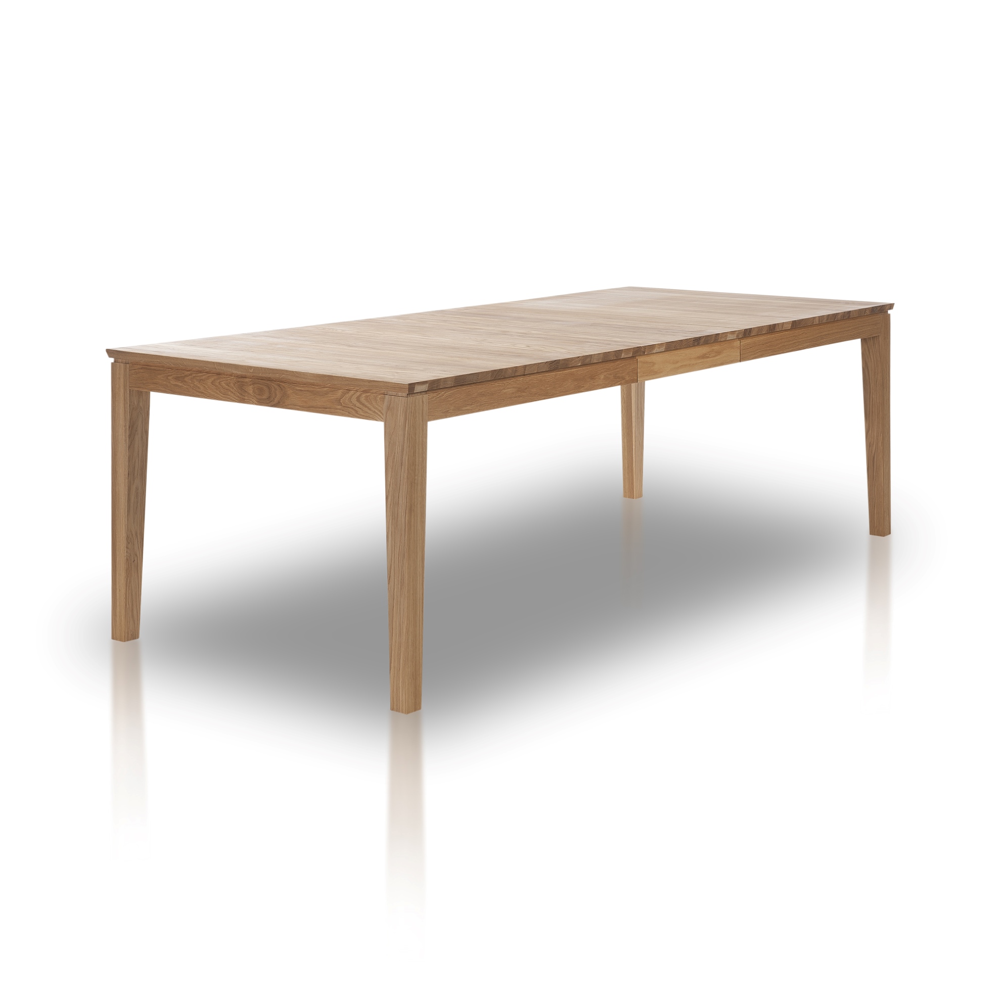 Дизайн OLIVIA усовершенствует форму классического обеденного стола, главное достоинство которого — красота дерева. Массивные ножки и широкий царговый пояс – неотъемлимые части образа «крепкого стола» – расположены не в глубине, а ближе к краям столешницы. Со скошенным краем, она словно парит над каркасом, приоткрывая стык.