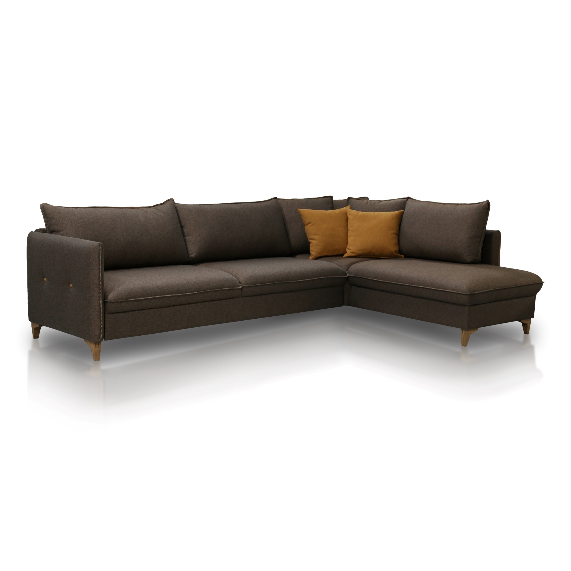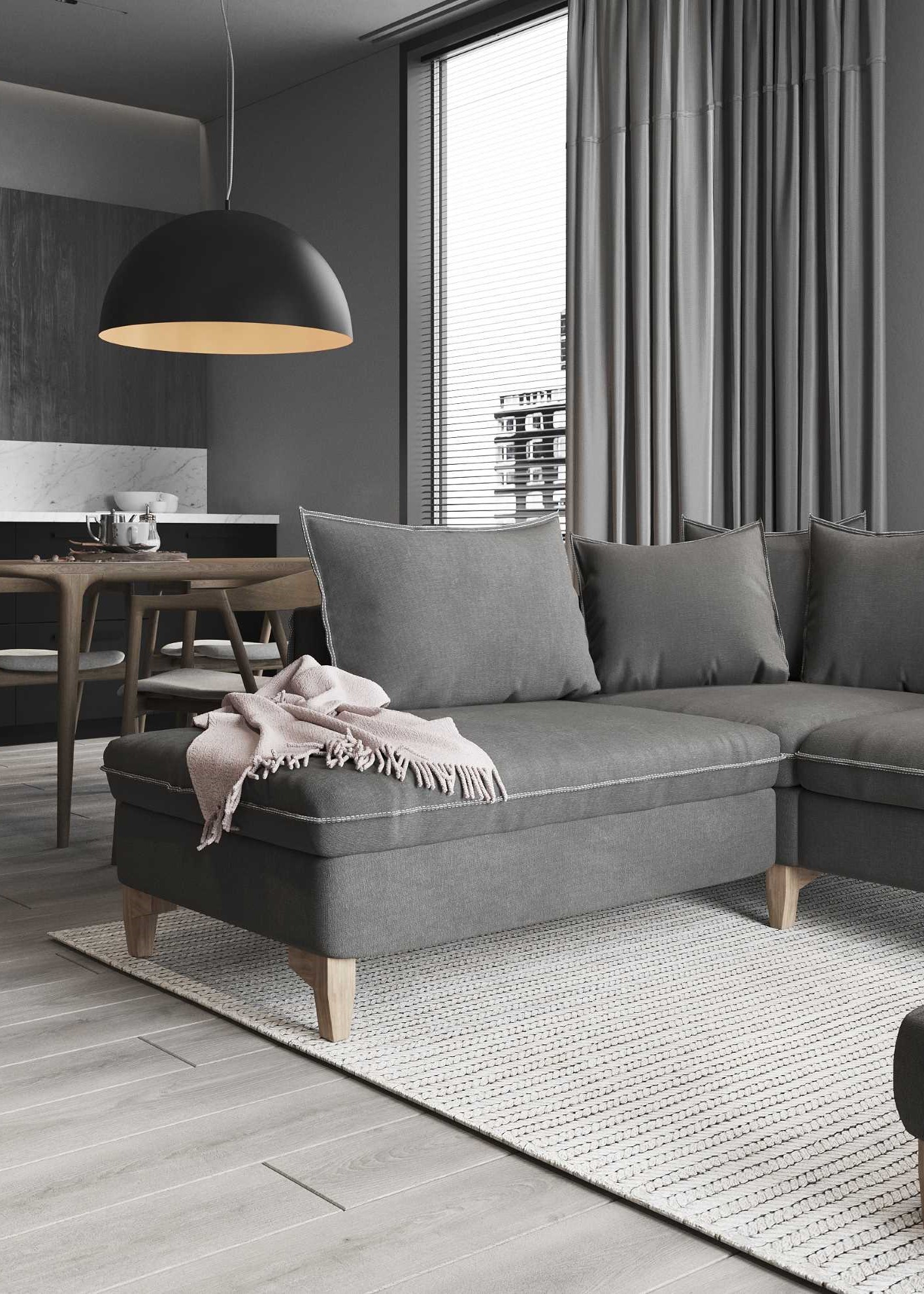 Кресло на деревянных ножках и вращающееся на металлической опоре, прямые и угловые диваны, пуф и журнальный столик – разнообразие готовых моделей коллекции позволит создать интерьер, выдержанный в едином стиле. Одна высота подлокотников и спинки формируют единую линию и создают ощущение уюта. Кант и декоративные пуговицы смягчают визуально строгий образ. Вращающееся кресло эффектно впишется в домашний кабинет, библиотеку или каминную зону. Угловой и прямой диван PEPPER в паре с журнальным столиком позволят эффектно зонировать объединенное пространство кухни-гостиной. Диван можно укомплектовать одним из механизмов трансформации для ежедневного сна: шагающая еврокнижка (Easy Deluxe) с ящиком для хранения и кинг (Nest), который встроен независимыми секциями.
