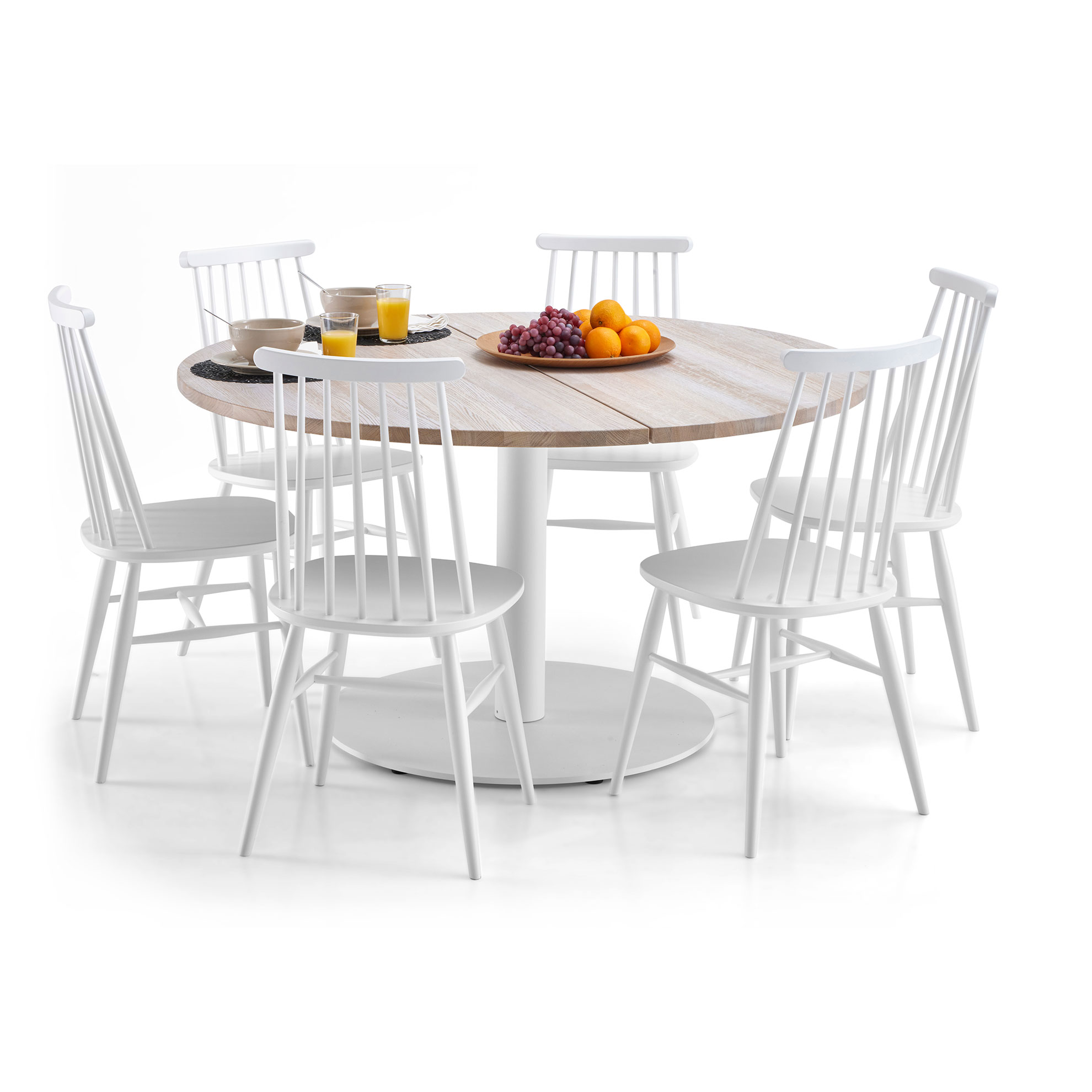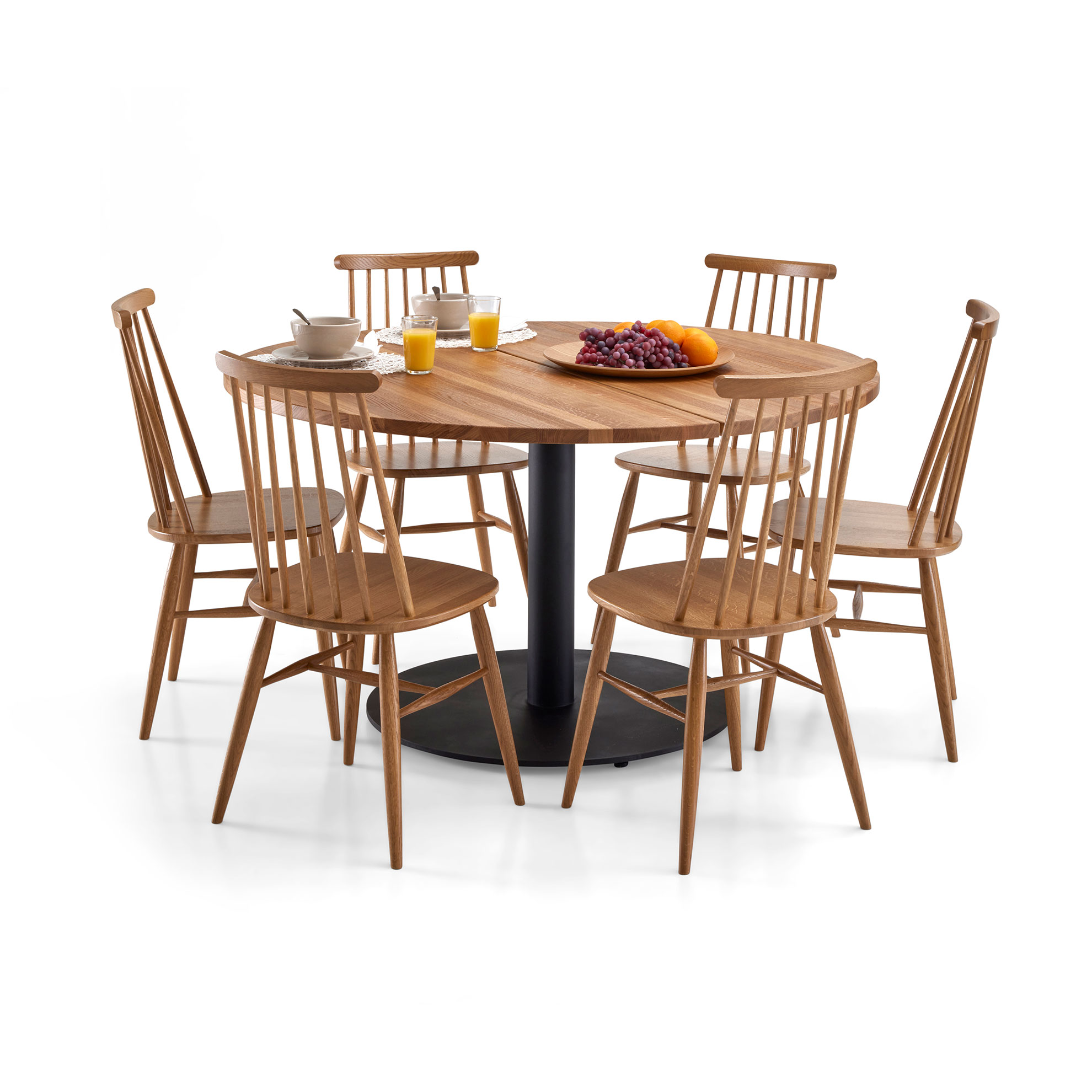 Дубовые столешницы разных диаметров выполнены в 6 различных тонировках: промасленный дуб, черный, Nordic, Smocked, матовый лак, тик, а прочное металлическое основание может быть окрашено в черный или белый цвет. Широкая палитра помогает вписать модель в скандинавские, современные интерьеры или лофт-пространства. Круглый стол позволит использовать площадь максимально эффективно и при этом разместить большое количество гостей на мягких обеденных стульях из этой же линейки. Компактные стулья RONDO – комфортное решение для столовой зоны. Удобная посадка, лаконичный дизайн и возможность персонализировать оттенок обивки и тонировку ножек из натурального дуба или березы – все это делает RONDO универсальной моделью для любого интерьера.